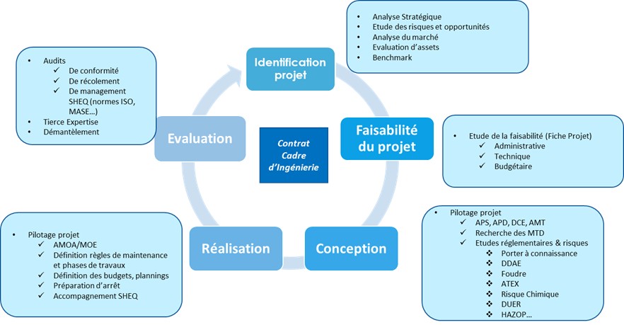 Depuis la phase de faisabilité jusqu’à la mise en service d’une installation (ou d’une logistique), elle a les capacités d’accompagner les projets de ses clients en passant par toutes ses phases essentielles :